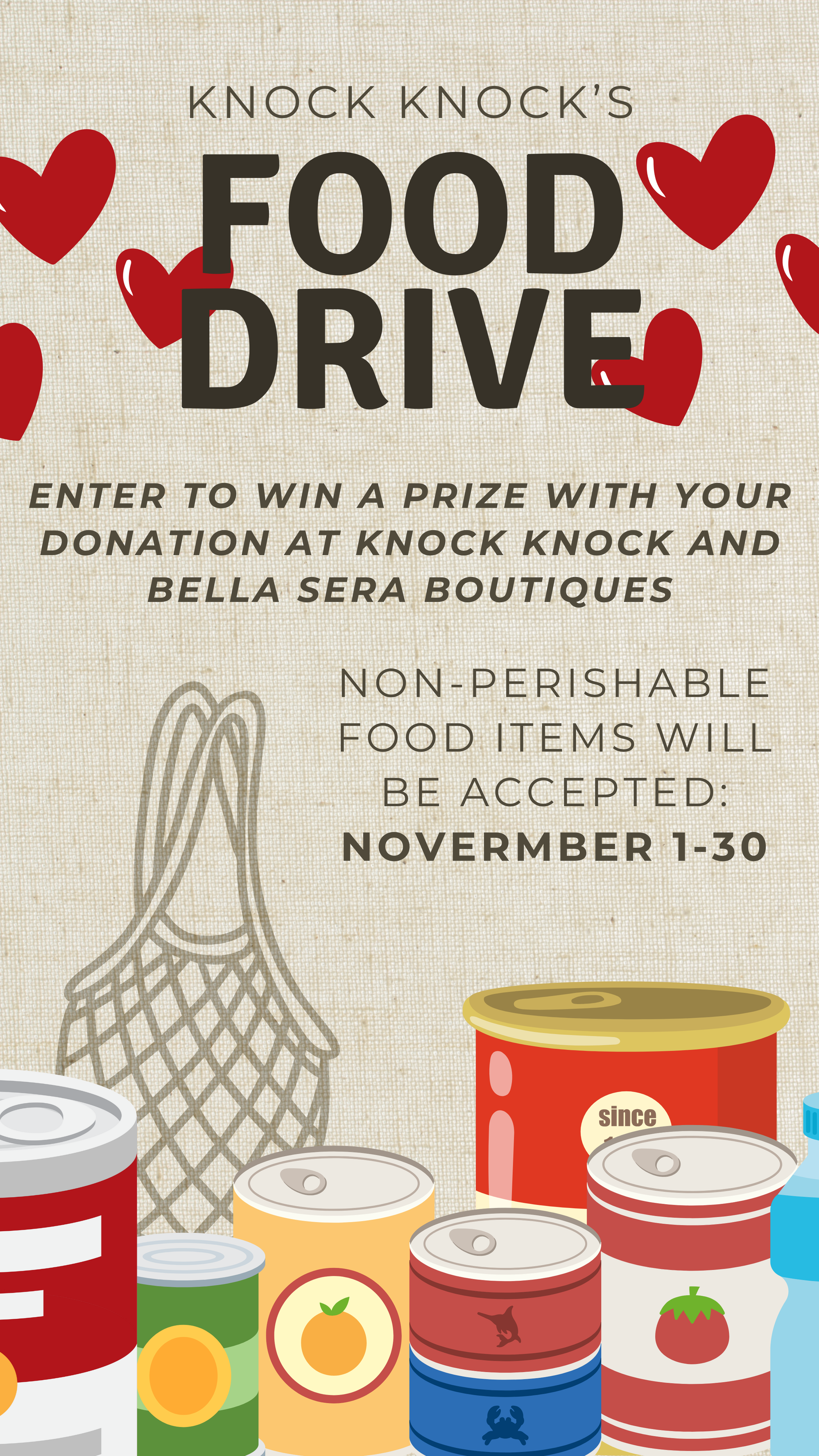 We're collecting donations of food & toiletries for local food distribution centers. Drop non-perishable food items off while you shop, and enter to win a prize!