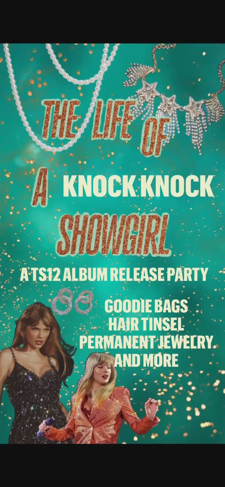 Save the date: OCTOBER 3: The Life of a Knock Knock Showgirl: A TS12 Album Release Party!!!!!!!!!!! Reserve your ticket for a gorgeous night of music and sparkles, surrounded by your fellow Swifties! Join us after daylight as we stream TS12, enjoy some sweet treats, add a permanent bracelet, hair tinsel, and upgrade your style. Each ticket is $25, and includes a goodie bag of exclusive merch to celebrate- you won't hear us say, "you need to calm down." We have an enchanted evening planned, don't blame me if you miss it! Tag a friend to say you belong with me at this party!!